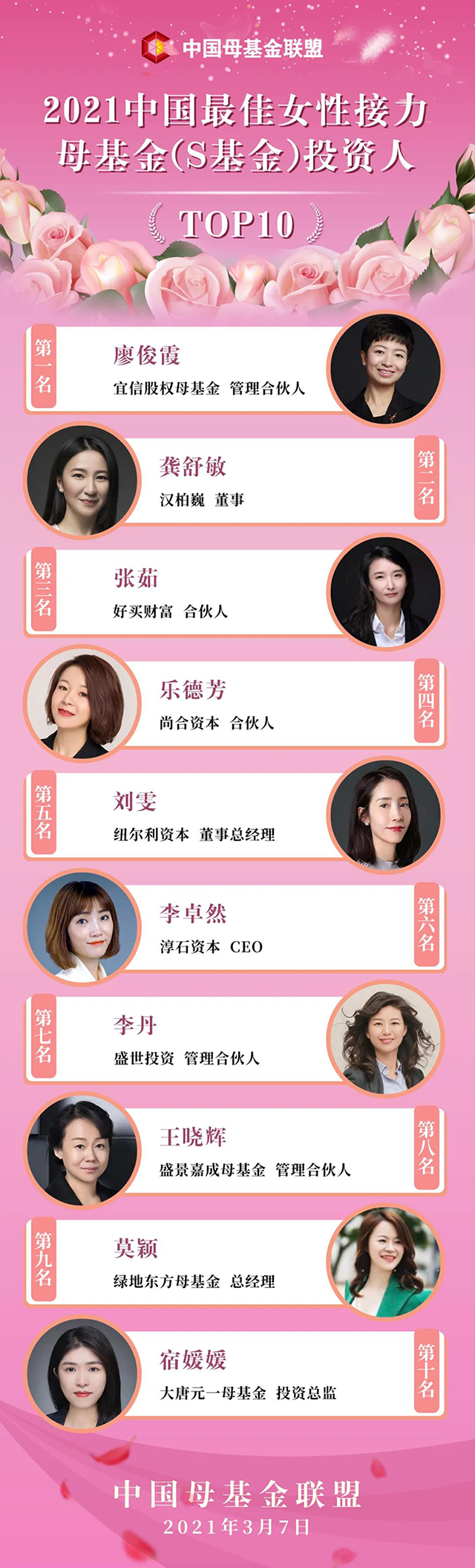 尚合資本管理合伙人乐德芳女士荣获「2021中国最佳女性接力母基金(S基金)投资人TOP10」奖项。